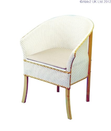 A traditional wooden frame commode chair with woven fibre upholstery in white and gold. The padded seat is removable and conceals a plastic commode pan and lid with carrying handle. The high chair sides give added stability to the user and also aid the person when rising.