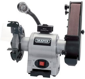 This Bench grinder from Draper is a workshop machine with one 150mm grinding wheel, 50 x 686mm sanding belt, worklight, dust extraction for sanding facility, adjustable eye protection shield, spark deflector, wheel guard, storage tray and tool rest. It is fitted with an approved plug and cable. Depending on the grade of grinding wheel you are using it may be used for sharpening cutting tools such as Lathe tools or drill bits. Alternatively it may be used to roughly shape metal prior to welding or fitting. A wire brush wheel or buffing wheels can be interchanged to with the grinding wheels in order to clean or polish work pieces.