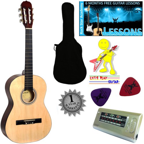 The package includes a great quality 3/4 size nylon string guitar. Guitar pitch pipes to keep the guitar perfectly tuned. A guitar gig bag with backpack strap to make carrying the guitar to school or lessons easy. 6 months of guitar tuition from Rock Star Academy with bonus lessons Lets Play Guitar for kids and a 1 year warranty.